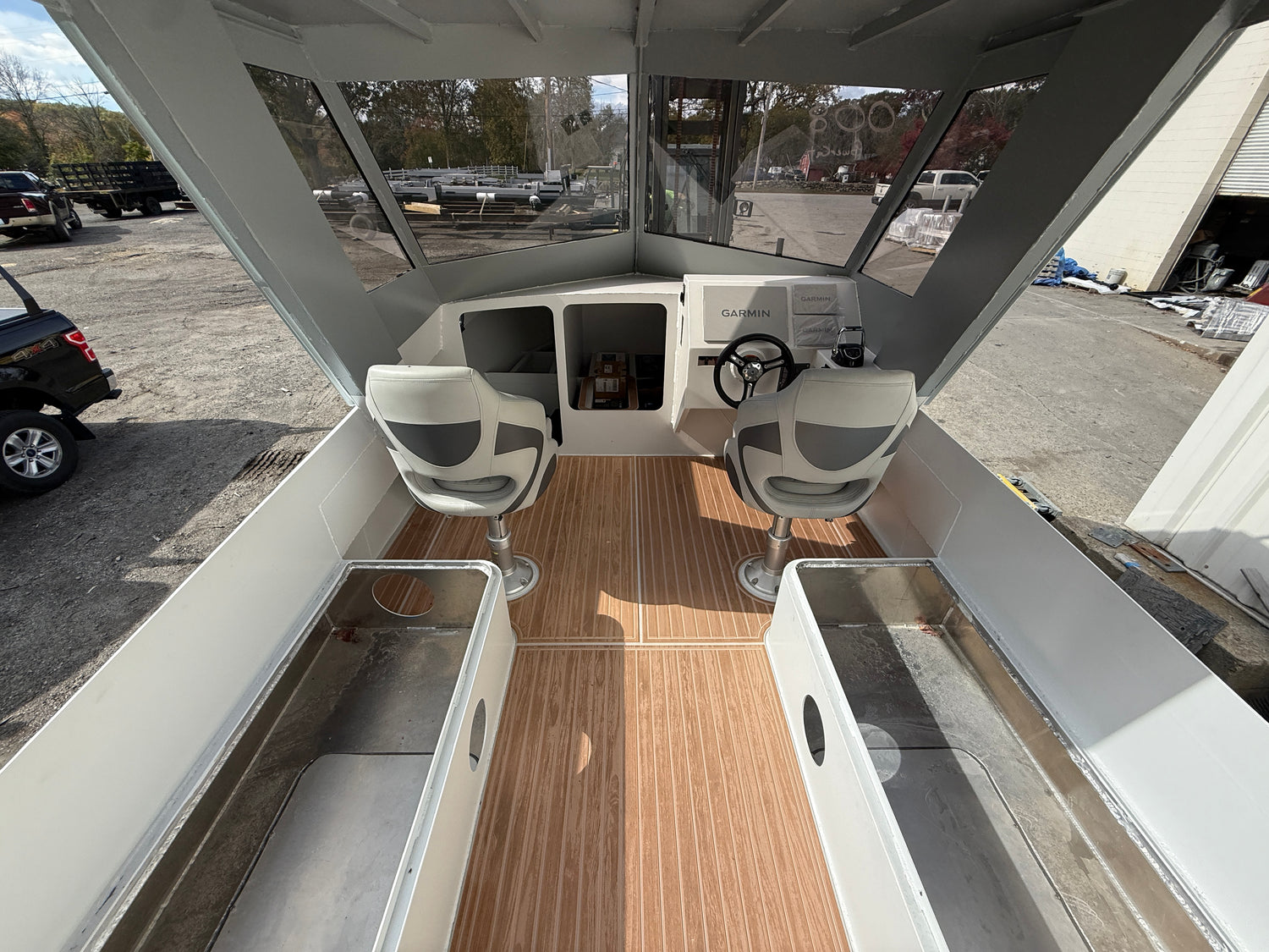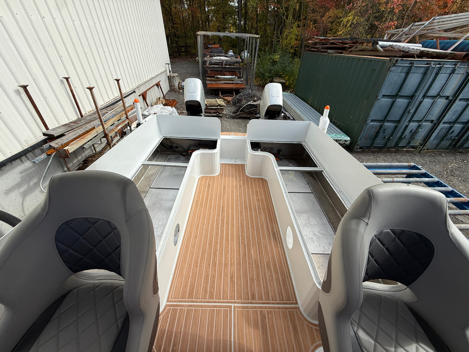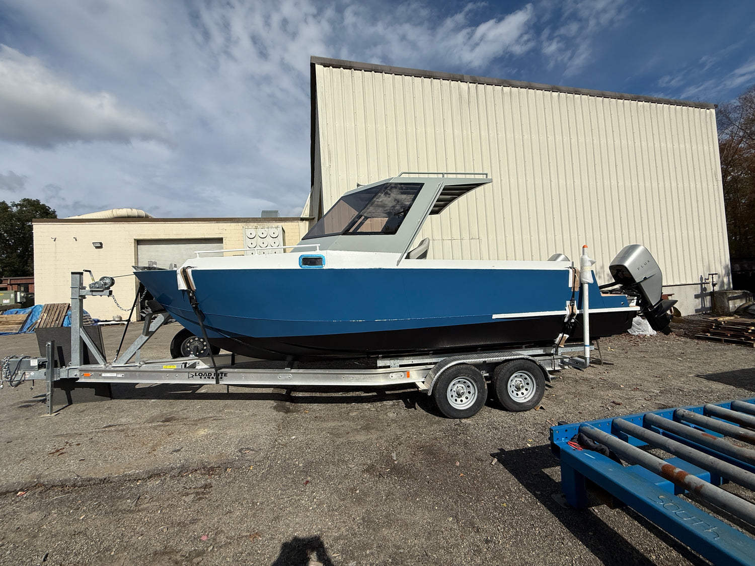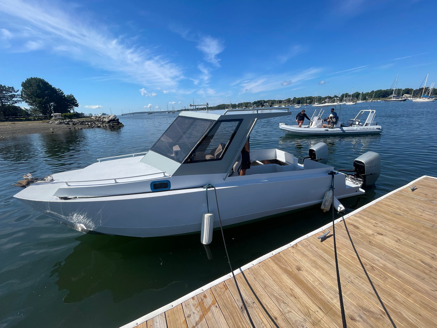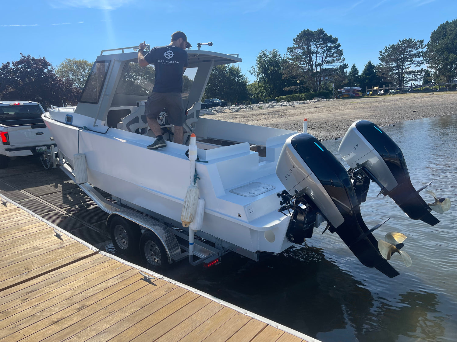 After the fabrication was completed, the boat was partially painted, then Flux Marine installed the propulsion system. The boat is powered by two 115 HP electric outboards, each with two 28kWh Li-Ion NMC battery packs, totaling 112kWh. Flux Marine completed initial sea trials in September of 2025.