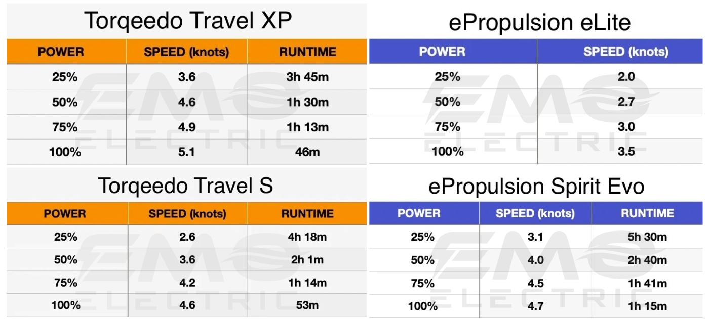 Torqeedo and ePropulsion provide accurate speed & run time data. The data from our testing was very similar to the numbers that ePropulsion and Torqeedo provide themselves.